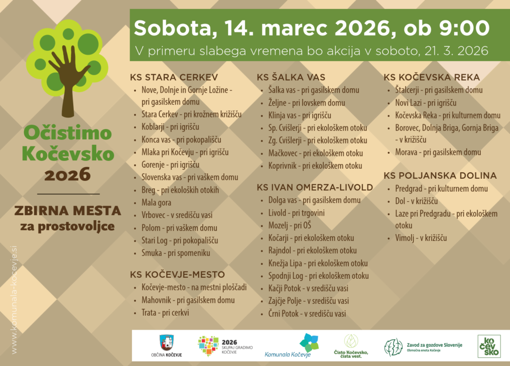 Vsi, ki želite biti boljši in sodelovati v Očistimo Kočevsko 2026 – v soboto, 14. marca 2026, se ob 9. uri pridružite prostovoljcem na zbirnih mestih po vaseh ali na mestni ploščadi.